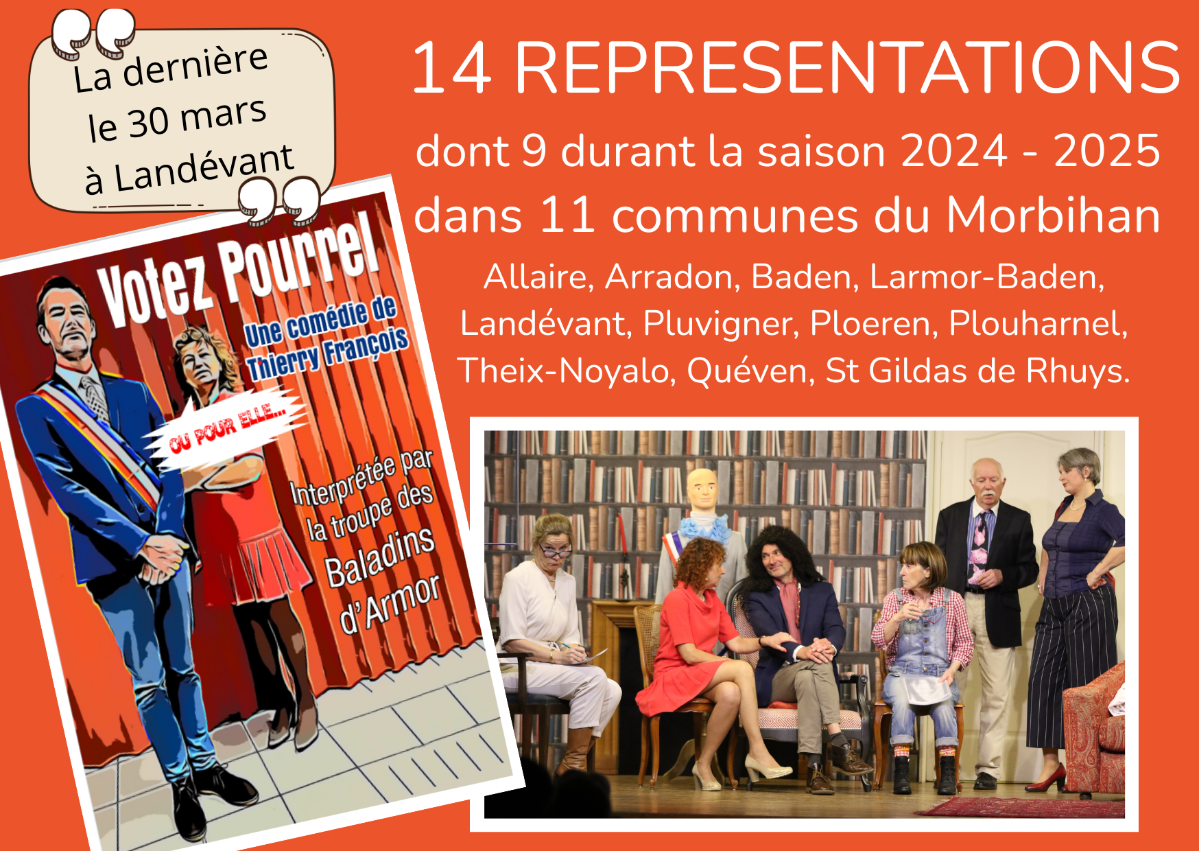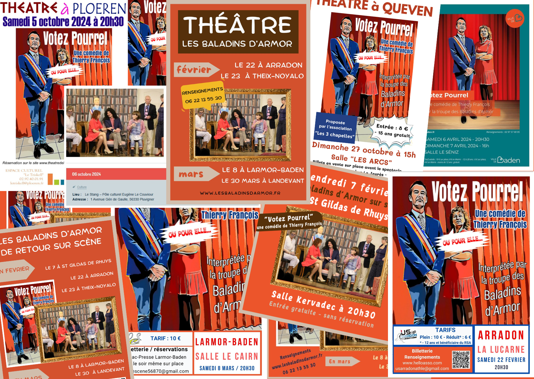 Synopsis : Marc Pourrel, maire ambitieux d’une petite commune, s’engage dans la bataille des élections législatives. Il est épaulé par son bras droit peu scrupuleux. Ensemble, ils ont l’habitude de manigancer… Mais l’arrivée d’une coach imposée par leur parti politique va venir bousculer leurs plans. La situation prend une tournure inattendue lorsque Madame Pourrel décide de se présenter aux élections, s’alliant avec sa charcutière de confiance pour affronter son propre mari. La campagne de Monsieur Pourrel est alors secouée par des rebondissements, et un accident de la route vient ajouter du piquant à l’intrigue en faisant intervenir Molière dans cette tragi-comédie électorale.
